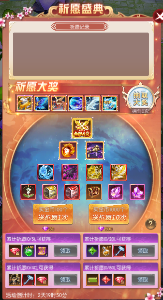 活动简介:活动期间可以消耗钻石购买金币进行祈愿,每次购买会赠送一个祈愿奖励 ;在奖池中抽到祈愿盛典大奖后,可在上方祈愿大奖奖池中抽取一次极品奖励(必然获得奖池中的极品奖励之一) ;祈愿达到累计次数可以获得对应的次数奖励,奖励多多 ;活动期间祈愿累计次数不会重置,活动结束后重置
