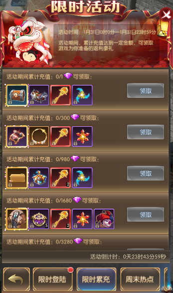 活动简介:活动期间,累计充值达到一定金额,可领取游戏为你准备的返利豪礼