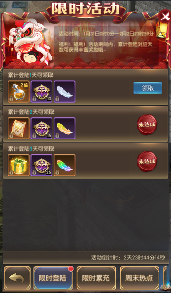 活动简介:福利!福利!活动期间内,累计登陆对应天数可获得丰富奖励哦~