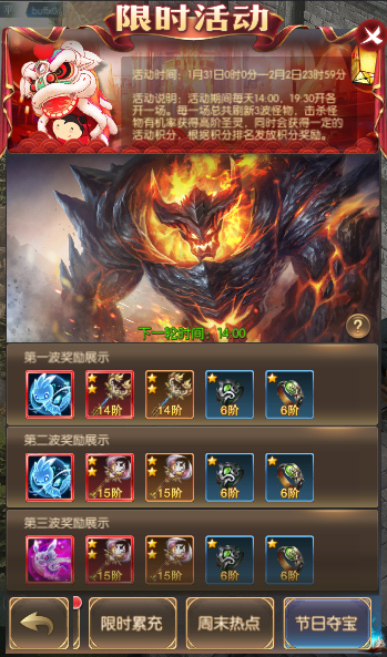 活动简介:活动期间每天14:00,19:30开各开一场。每一场总共刷新3波怪物,击杀怪物有获得高阶圣灵,同时会获得一定的活动积分,根据积分排名发放积分奖励。