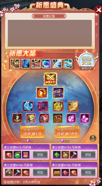 活动简介:活动期间可以消耗钻石购买金币进行祈愿,每次购买会赠送一个祈愿奖励 ;在奖池中抽到祈愿盛典大奖后,可在上方祈愿大奖奖池中抽取一次极品奖励(必然获得奖池中的极品奖励之一) ;祈愿达到累计次数可以获得对应的次数奖励,奖励多多 ;活动期间祈愿累计次数不会重置,活动结束后重置