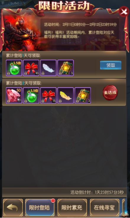 活动简介:福利!福利!活动期间内,累计登陆对应天数可获得丰富奖励哦~