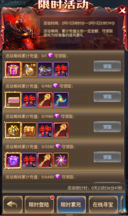 活动简介:活动期间,累计充值达到一定金额,可领取游戏为你准备的返利豪礼