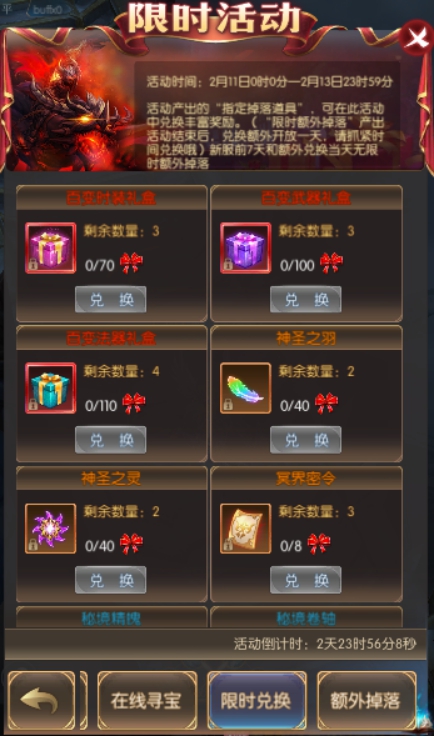 活动简介:活动期间,击杀250级以上世界boss、所有个人boss、冥界禁域、boss之家可额外掉落指定兑换道具,可在“限时兑换”活动中兑换丰富奖励;180级以上玩家野外挂机可额外掉落指定兑换道具,可在“限时兑换”活动中兑换丰富奖励