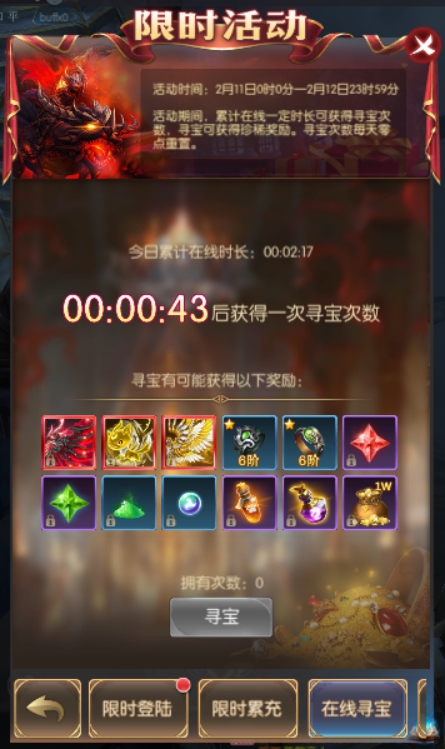 活动简介:活动期间,累计在线一定时常可获得寻宝次数,寻宝可获得珍稀奖励。寻宝次数每天零点重置。