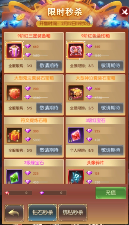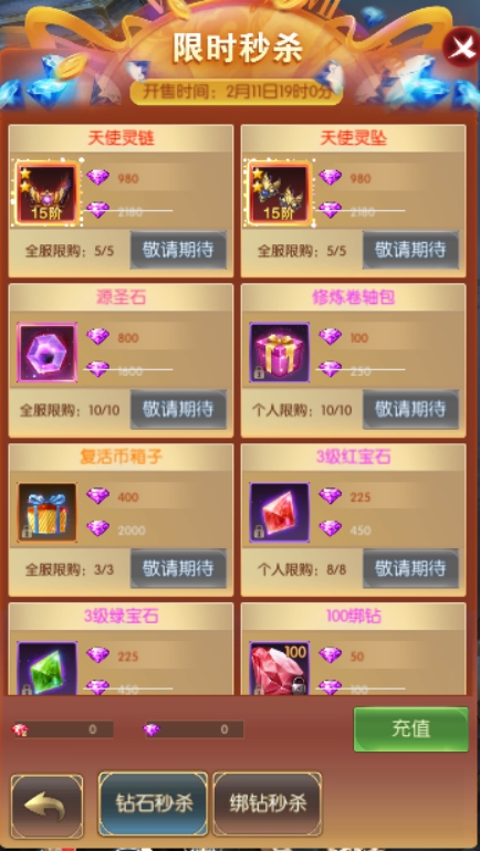 活动简介:活动期间,玩家能以超低的价格秒杀原价道具,机会不容错过。