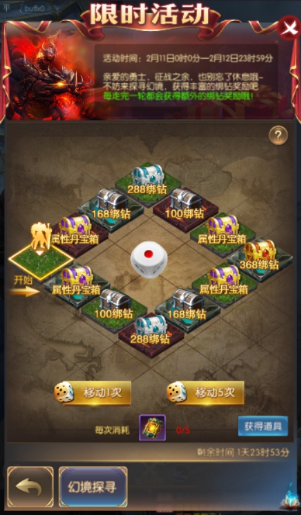 3.投骰子需要消耗幻境探寻道具。幻境探寻道具会通过钻石商城购买、累充和限时兑换获得。