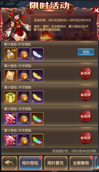 活动简介:福利!福利!活动期间内,累计登陆对应天数可获得丰富奖励哦~
