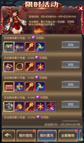 活动简介:活动期间,累计充值达到一定金额,可领取游戏为你准备的返利豪礼