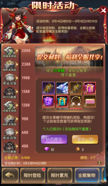 活动简介:提交指定材料,获得惊喜奖励,全服达到指定数量可激活全服奖励!