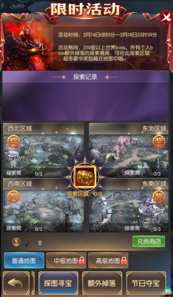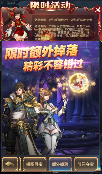 活动简介:活动期间,250级以上世界boss、所有个人boss额外掉落探索道具,可在同期的探图寻宝活动中探索区域获得奖励。