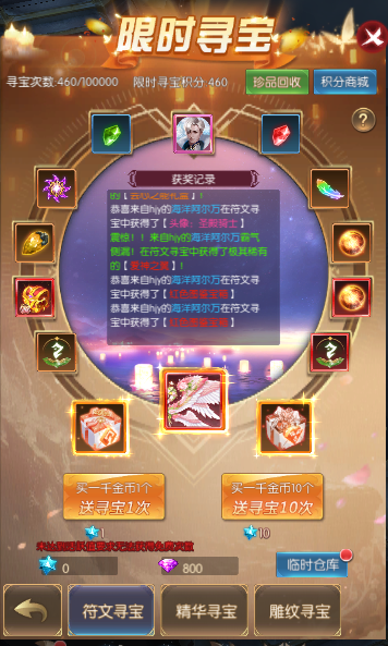 活动简介:进行寻宝即可获得丰厚奖励;限时寻宝时获得的积分,可在限时寻宝积分商城兑换珍稀道具,仅在限时寻宝开启时可使用,本次开启未用完的积分会保持到下次开启依旧可以使用