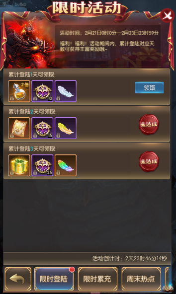 活动简介:福利!福利!活动期间内,累计登陆对应天数可获得丰富奖励哦~