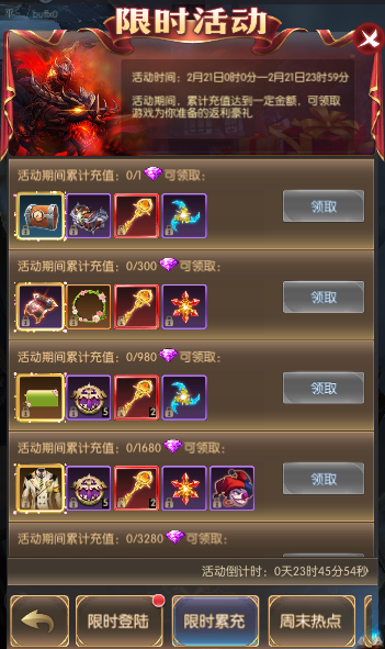 活动简介:活动期间,累计充值达到一定金额,可领取游戏为你准备的返利豪礼