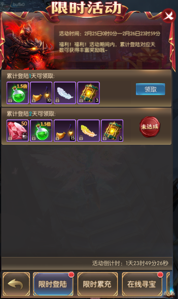 活动简介:福利!福利!活动期间内,累计登陆对应天数可获得丰富奖励哦~