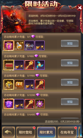 活动简介:活动期间,累计充值达到一定金额,可领取游戏为你准备的返利豪礼