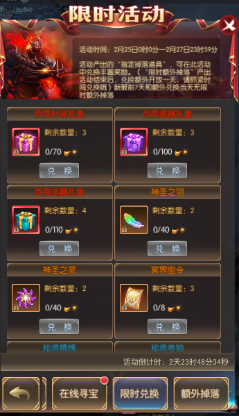 活动简介:活动期间,击杀250级以上世界boss、所有个人boss、冥界禁域、boss之家可额外掉落指定兑换道具,可在“限时兑换”活动中兑换丰富奖励;180级以上玩家野外挂机可额外掉落指定兑换道具,可在“限时兑换”活动中兑换丰富奖励