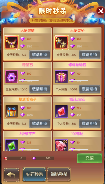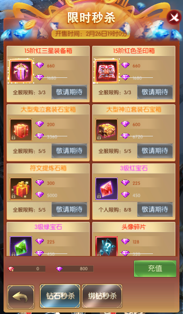活动简介:活动期间,玩家能以超低的价格秒杀原价道具,机会不容错过。
