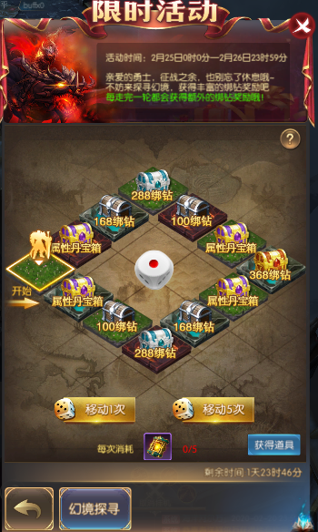 3.投骰子需要消耗幻境探寻道具。幻境探寻道具会通过钻石商城购买、累充和限时兑换获得。
