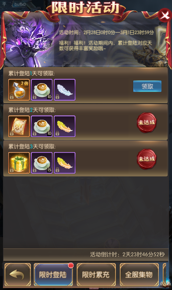 累计登陆3天 | 疲劳礼盒,咖啡*15,神圣之羽 |