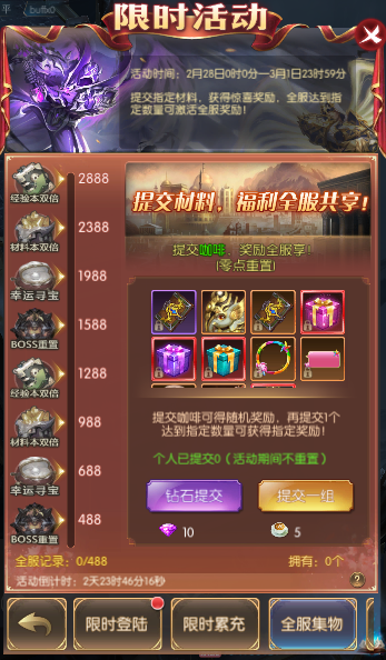 活动简介:提交指定材料,获得惊喜奖励,全服达到指定数量可激活全服奖励!