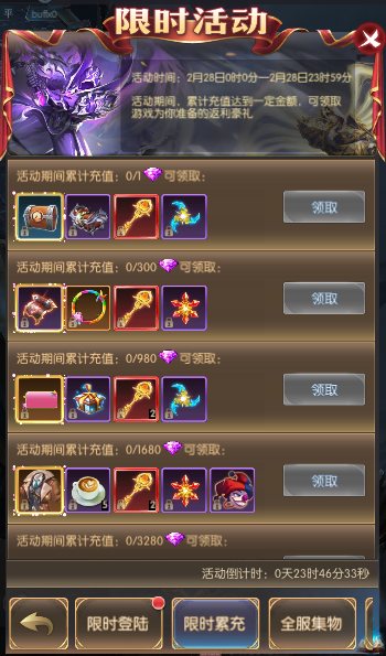 活动简介:活动期间,累计充值达到一定金额,可领取游戏为你准备的返利豪礼