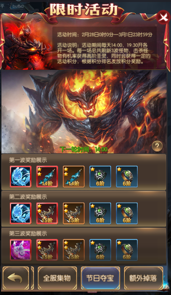 活动简介:活动期间每天14:00,19:30开各开一场。每一场总共刷新3波怪物,击杀怪物有获得高阶圣灵,同时会获得一定的活动积分,根据积分排名发放积分奖励。