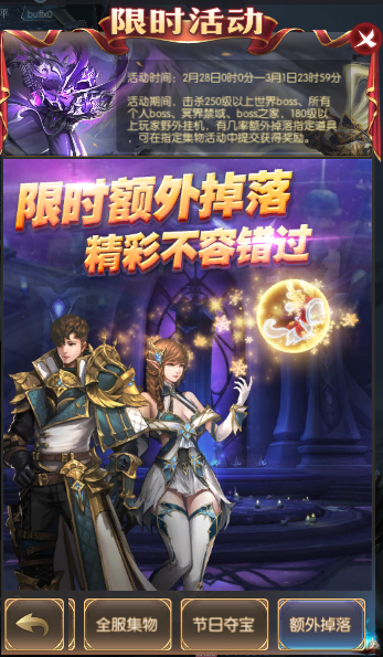 活动简介:活动期间,击杀250级以上世界boss、所有个人boss、冥界禁域、boss之家。180级以上玩家野外挂机有额外掉落指定道具,可在指定全服集物活动中提交获得奖励。