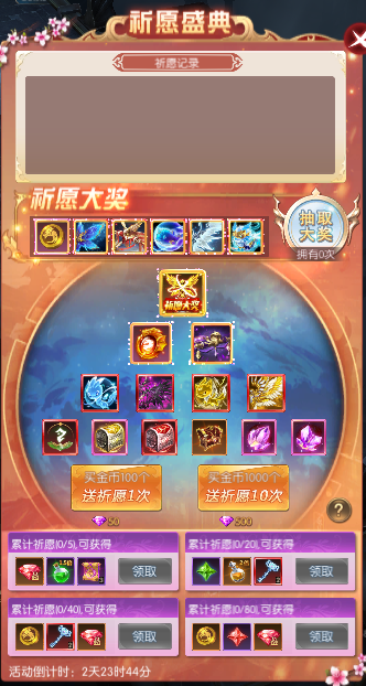 活动简介:活动期间可以消耗钻石购买金币进行祈愿,每次购买会赠送一个祈愿奖励 ;在奖池中抽到祈愿盛典大奖后,可在上方祈愿大奖奖池中抽取一次极品奖励(必然获得奖池中的极品奖励之一) ;祈愿达到累计次数可以获得对应的次数奖励,奖励多多 ;活动期间祈愿累计次数不会重置,活动结束后重置