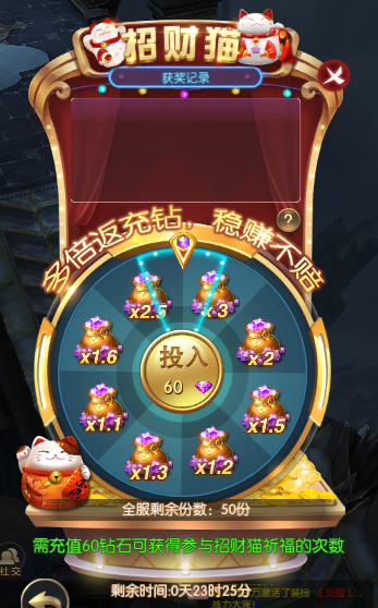 2.每个档位的招财猫每位玩家只能参与一次,并且全服有一定的参与份数总数,以上两个份数任意一个被买完则会自动进入下一档