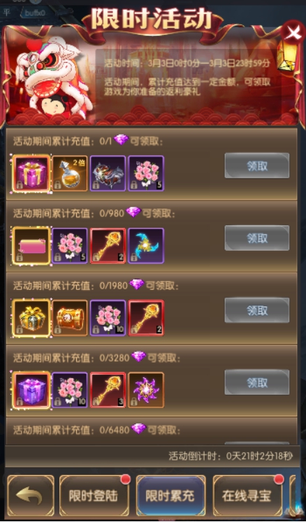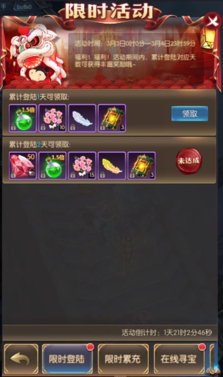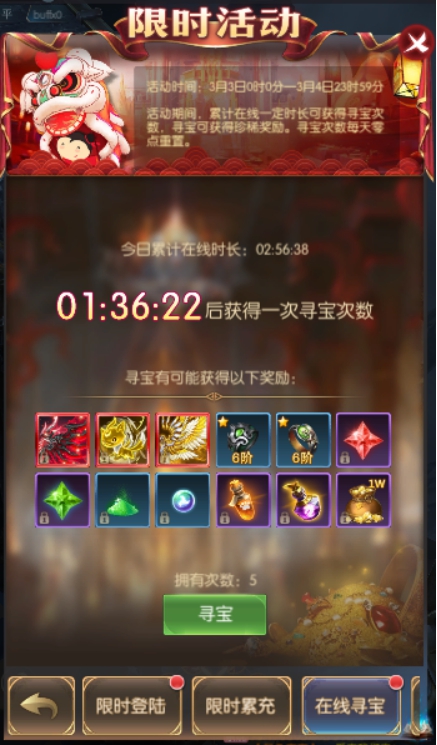 活动简介:活动期间,累计在线一定时常可获得寻宝次数,寻宝可获得珍稀奖励。寻宝次数每天零点重置。