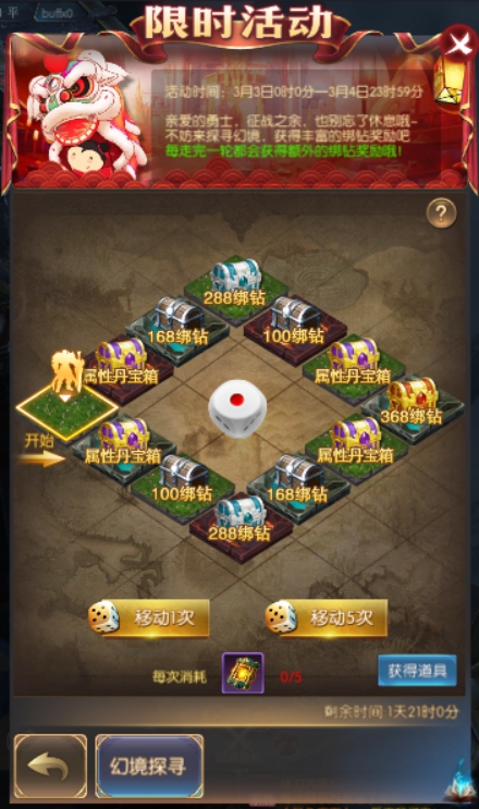 3.投骰子需要消耗幻境探寻道具。幻境探寻道具会通过钻石商城购买、累充和限时兑换获得。
