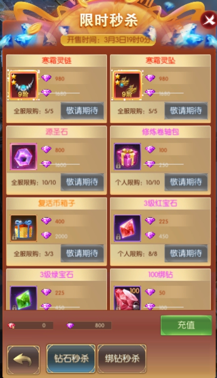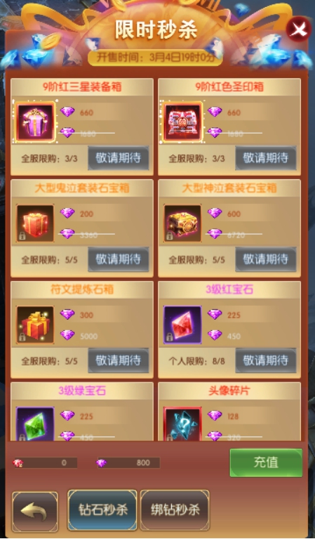 活动简介:活动期间,玩家能以超低的价格秒杀原价道具,机会不容错过。