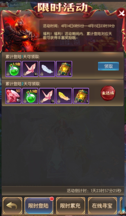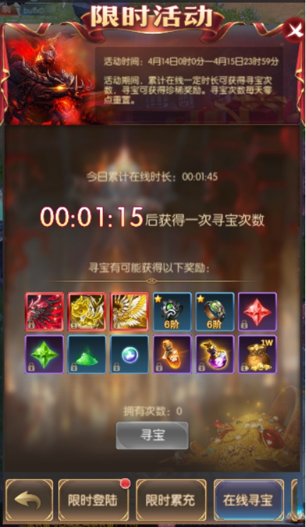 活动简介:活动期间,累计在线一定时常可获得寻宝次数,寻宝可获得珍稀奖励。寻宝次数每天零点重置。