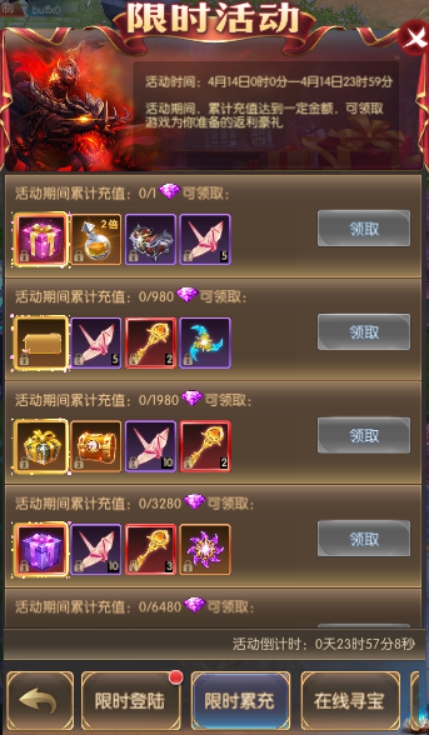 活动简介:活动期间,累计充值达到一定金额,可领取游戏为你准备的返利豪礼