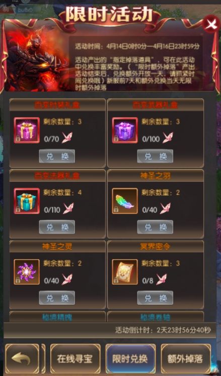 活动简介:活动期间,击杀250级以上世界boss、所有个人boss、冥界禁域、boss之家可额外掉落指定兑换道具,可在“限时兑换”活动中兑换丰富奖励;180级以上玩家野外挂机可额外掉落指定兑换道具,可在“限时兑换”活动中兑换丰富奖励