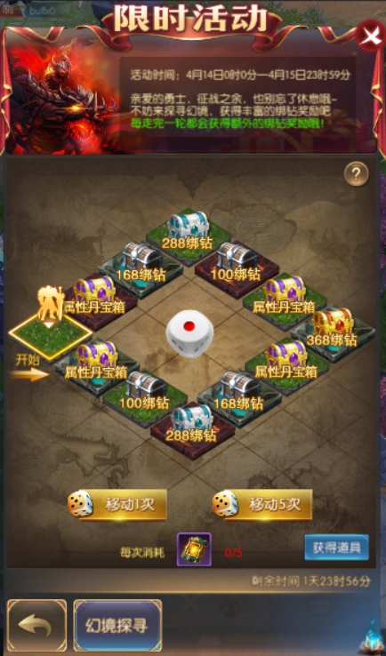 3.投骰子需要消耗幻境探寻道具。幻境探寻道具会通过钻石商城购买、累充和限时兑换获得。