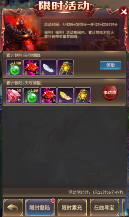 活动简介:福利!福利!活动期间内,累计登陆对应天数可获得丰富奖励哦~