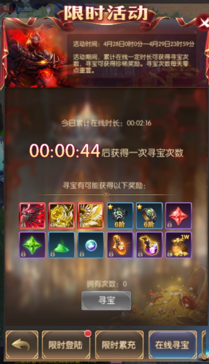 活动简介:活动期间,累计在线一定时常可获得寻宝次数,寻宝可获得珍稀奖励。寻宝次数每天零点重置。