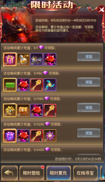 活动简介:活动期间,累计充值达到一定金额,可领取游戏为你准备的返利豪礼