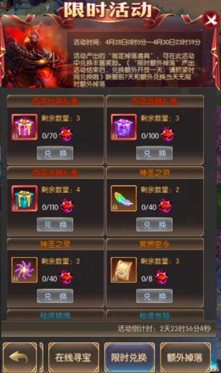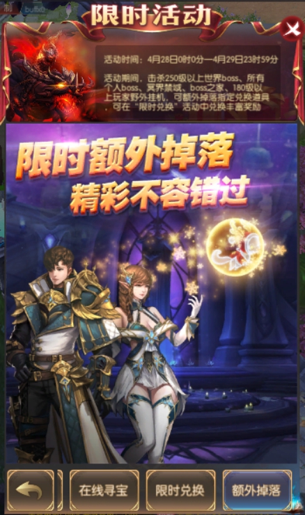 活动简介:活动期间,击杀250级以上世界boss、所有个人boss、冥界禁域、boss之家可额外掉落指定兑换道具,可在“限时兑换”活动中兑换丰富奖励;180级以上玩家野外挂机可额外掉落指定兑换道具,可在“限时兑换”活动中兑换丰富奖励
