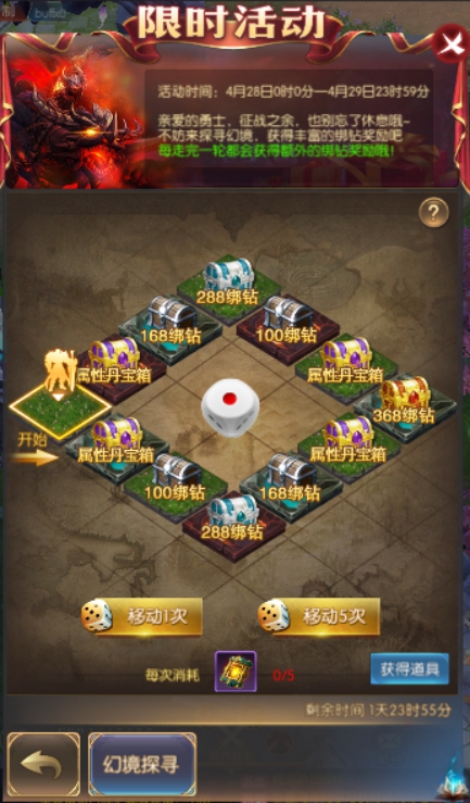 3.投骰子需要消耗幻境探寻道具。幻境探寻道具会通过钻石商城购买、累充和限时兑换获得。