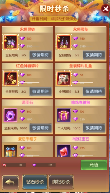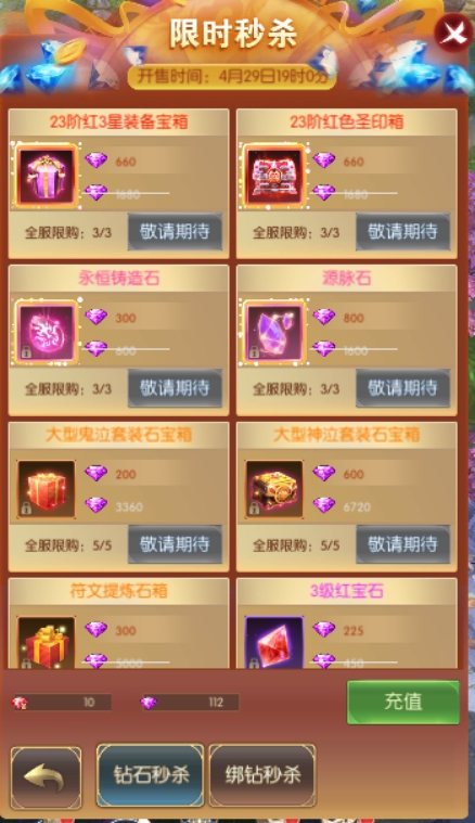 活动简介:活动期间,玩家能以超低的价格秒杀原价道具,机会不容错过。