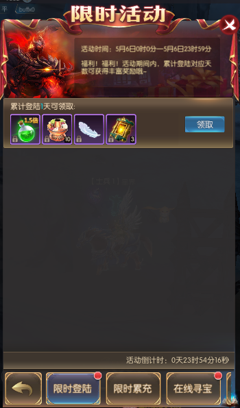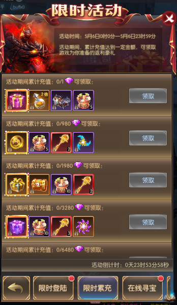 活动简介:活动期间,累计充值达到一定金额,可领取游戏为你准备的返利豪礼
