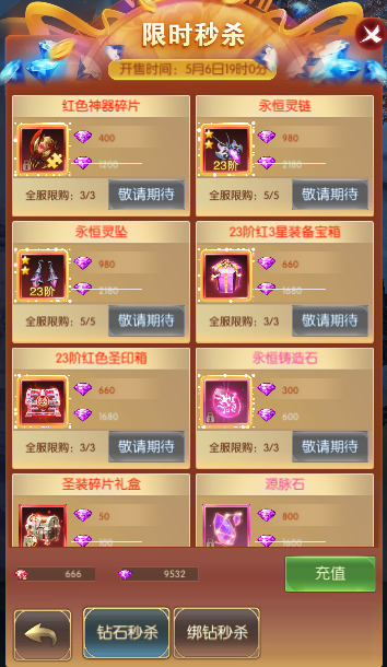 活动简介:活动期间,玩家能以超低的价格秒杀原价道具,机会不容错过。