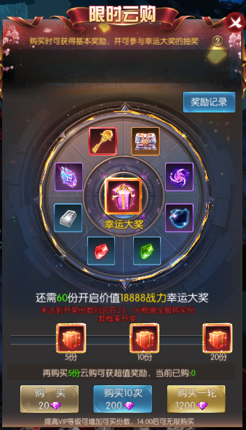 2.云购活动10:00开启购买,在到达14:00之前,玩家可以购买一定份数的云购(可购买份数与VIP等级有关)