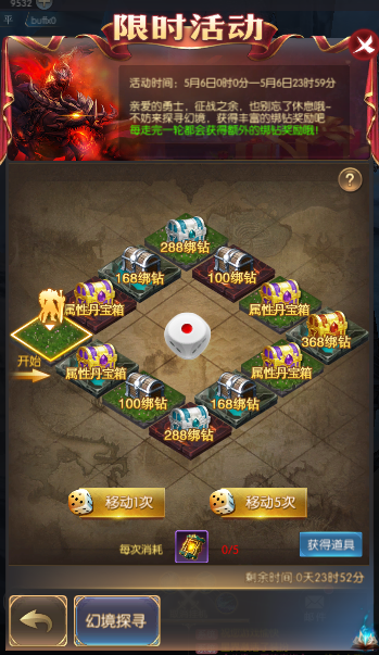 3.投骰子需要消耗幻境探寻道具。幻境探寻道具会通过钻石商城购买、累充和限时兑换获得。