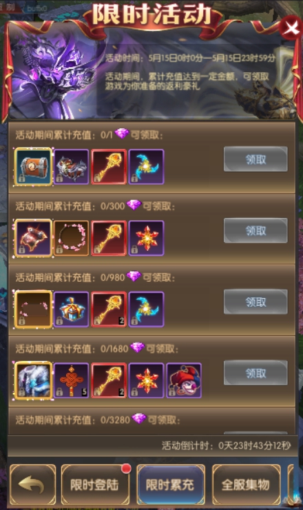 活动简介:活动期间,累计充值达到一定金额,可领取游戏为你准备的返利豪礼