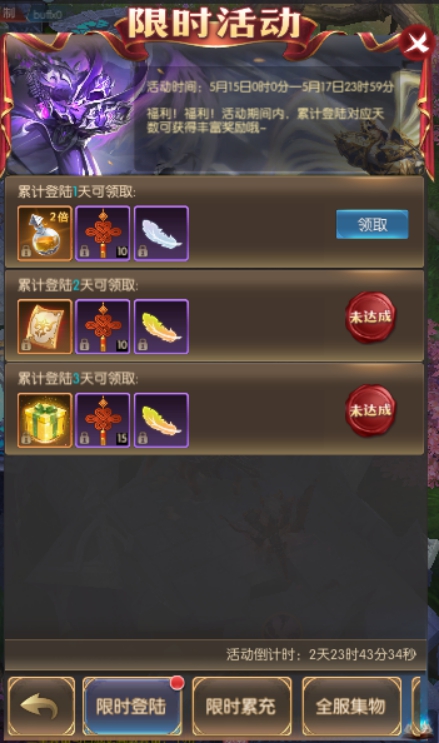 活动简介:福利!福利!活动期间内,累计登陆对应天数可获得丰富奖励哦~