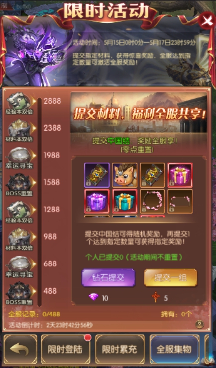 活动简介:提交指定材料,获得惊喜奖励,全服达到指定数量可激活全服奖励!